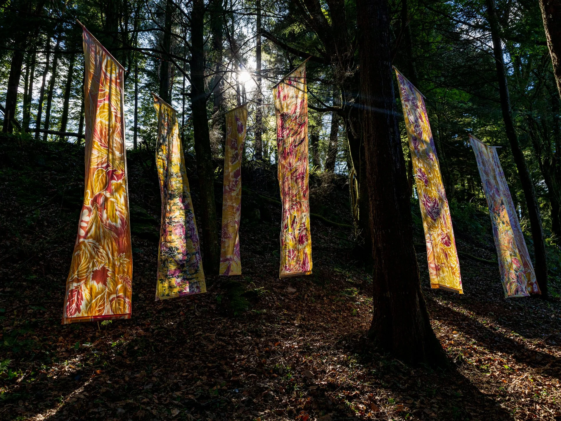 Commissioned by Greywood Arts for their May Sunday Festival and Art Trail, Fréamhacha/Korin’ja (Roots) was a co creative process with a group of local women in East Cork and Ukrainian refugees living in Redbarn, Youghal. This project points to identity, belonging, placemaking and establishing connections. Inspired by The Hidden Life of Trees, by Peter Wohlleben, which proclaims that trees are sentient and communal, intelligent, resourceful and generous, the group explored native and non-native trees in the local and very beautiful Glenbower Woods. Combining the yellow colour of May flowers alongside red to represent the Bealtaine bonfires, the group used the labour intensive process of layers of wax-resist dyeing on cotton, to make these banners. Emblematic of mycorrhiza, the symbiotic underground network and support system that exists between plants and fungi, we have employed the sgraffito and crackle techniques in batik as an allegory for gestures of support among humanity in times of crisis. Each participant also created their own individual Batik piece, inspired by native plants and trees in Ireland and Ukraine.
